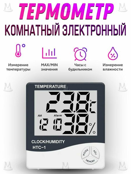 Электронный термометр-гигрометр HTC-1 предназначен для измерения температуры и влажности воздуха внутри помещений. В качестве дополнительных функций в устройстве имеются часы с будильником и календарь. Вся информация выводится на большой ЖК дисплей. Питается данный прибор от одного элемента типоразмера AAA/LR03/R03. На обратной стороне корпуса имеется подставка для настольной установки и отверстие для крепления на стену. Термометр-гигрометр HTC-1 может запоминать минимальное и максимальное значения температуры и влажности. Инструкция по эксплуатации на русском языке в фотографиях товара. Особенности: