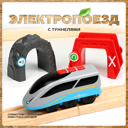 Электропоезд на батарейке, туннель и мост-туннель для деревянной железной дороги. Электропоезд издаёт сигнал и возвращается назад при прохождении тоннелей. Важно: эти функции работают только при движении поезда по полотну железной дороги. Игровой набор изготовлен из современных материалов, которые отличаются высоким уровнем качества и не содержит в своём составе вредных или опасных веществ и примесей. Такой комплект позволит вашему малышу расширить функциональные возможности имеющейся трассы и деревянной железной дороги. Достаточно собрать маршрут движения, поставить на него поезд, туннель, мост-туннель и нажать кнопку сверху на поезде. Игра станет более интересной и увлекательной. Радость и смех обеспечены. Набор отлично разнообразит игру Ваших малышей с деревянной железной дорогой. Поезд на батарейках имеет магнит, с помощью которого можно присоединить другие вагоны. Комплект состоит из трёх предметов: электропоезд, туннель и мост-туннель. Набор станет идеальным дополнением к любым деревянным железным дорогам. Добавьте новые сюжеты игр к любимой железной дороге с помощью нашего комплекта.