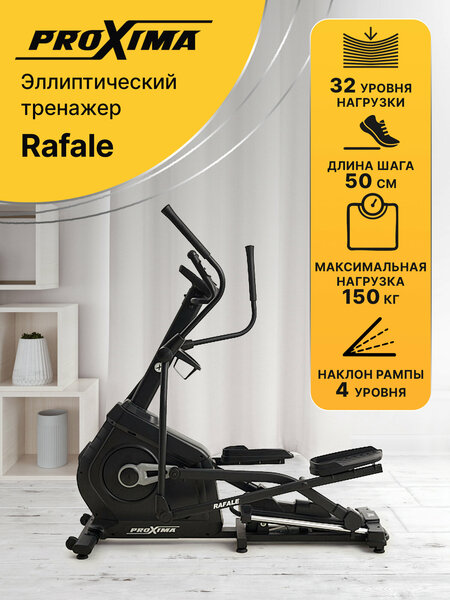 Proxima Fitness — один из старейших брендов с надежной репутацией в мире домашних тренажеров. По данным журнала Тинькофф, эллиптические тренажеры Proxima Fitness занимают лидирующие позиции в рейтингах, подтверждая свое превосходство в качестве, надежности и инновациях. Переднеприводной эллиптический тренажер PROXIMA Rafale – надежный тренажер для домашнего фитнеса. В основе конструкции корпуса использована прочная высоколегированная сталь, что гарантирует долговечность устройства и обеспечивает максимальную нагрузку на конструкцию до 150 кг. Защитные кожухи тренажера изготовлены из инженерно-технологичного пластика, который отличается высокими значениями механической прочности, электросопротивления, диэлектрической проницаемости. Rafale оснащен механизмом изменения наклона рампы в 4-х уровнях. Данная функция наклона рампы позволяет адаптировать тренажер под разные цели, создать нагрузку на разные группы мышц, использовать разные типы тренировок. Длина шага 50 см создает отличную траекторию движения для эффективности занятий и полной безопасности суставов и является оптимальной для пользователей любого роста. Для сборки тренажера использованы профессиональные подшипники во всех сочленениях, используемые в авиастроительной отрасти. Широкие направляющие, фронтальные стабилизаторы, профессиональные подшипники - позволили создать надежный долговечный тренажер, предназначенный для интенсивной эксплуатации. Кроме того, обладающий максимально плавным ходом для комфортной тренировки. Консоль управления представлена качественным цветным LCD размером 136 x 72 мм , отображающего все параметры и ход тренировки. Программный пакет включает 12 вариантов программ, позволяющих выбрать наиболее подходящий вариант для пользователей с разной степенью подготовки. Держатель бутылки для воды и другие дополнительные функциональные особенности сделают время, затраченное на тренажере, максимально комфортным и эффективным.