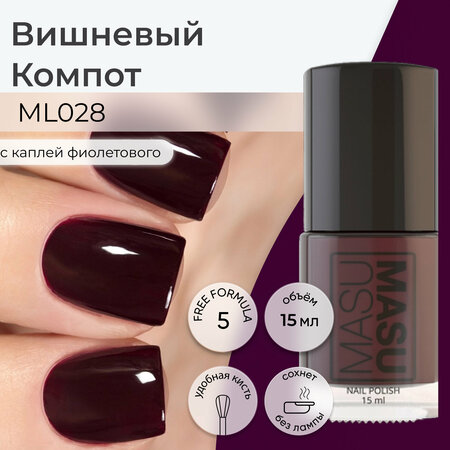 Околочерный бордовый с каплей фиолетового и коричневого. Лаки для ногтей серии MASU MASU от бренда MASURA помогут создать неповторимый маникюр, подчеркнуть красоту и ухоженность ваших ногтей. Бренд Masura знаменит своими инновационными формулами, разнообразием оттенков и профессиональным подходом к уходу за ногтями. В ассортименте представлены уходовые лаки для укрепления ногтей; антигрибковые средства; светоотражающие, голографические и магнитные лаки; ТОП-покрытия (с мультихромной слюдой и прозрачные с высоким блеском). Лаки MASU MASU легко наносятся, быстро сохнут и радуют стойким и блестящим покрытием. Безопасная 5-Free формула лаков гарантирует отсутствие в составе вредных компонентов, что делает их идеальным выбором для обеспечения здоровых и крепких ногтей. Лак не только улучшит внешний вид ваших ноготков, но и обеспечит им необходимый уход и защиту. Особое внимание стоит уделить важности лаковой базы и топовых покрытий Masura. Они не только придают долговечность маникюру и педикюру, но и усиливают блеск, цветовую насыщенность и защиту, сохраняя Ваш маникюр идеальным до 7 дней. Способ применения: 1. Обезжирьте ногтевую пластину . 2. Нанесите базу для лака, она защитит и укрепит ногти . Просушите. 3. Нанесите первый тонкий слой цветного лака. Просушите. 4. Нанесите второй слой лака, его можно сделать более плотным. Просушите. 5. Завершите маникюр нанесение ТОП-покрытия для лака. Он зафиксирует цвет, продлит время носки и придаст дополнительный блеск покрытию. Лак для ногтей высыхает на воздухе и не требует сушки в УФ и LED лампе. Снимается жидкостью для снятия лака. Цветопередача может отличаться, так как фото и видео сделаны профессиональным оборудованием и при максимальной освещенности. На фотографиях и видео цвет нанесен в 2 слоя и покрыт ТОПом. Состав: Butyl Acetate, Ethyl Acetate, Nitrocellulose, Acetyl Tributyl Citrate, Isopropyl Alcohol, Adipic Acid/Neopentyl Glycol/Trimellitic Anhydride Copolymer, Stearalkonium Bentonite, Styrene/Acrylates Copolymer, +/- Silicon Dioxide, Polyethylene Terephthalate, Calcium Aluminum Borosilicate, CI 77266, CI 42090, CI 77007, CI 77288, CI 15850, CI 77491, CI 77492, CI 77499, CI 77891, CI 19140, CI 77000, CI 77861.