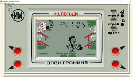 ! Данная версия для android ! Эмулятор электронной игры, которая была популярна в конце 80-х-начале 90-х годов 20 века - Электроника ИМ02 "Ну, Погоди!". Игра на внимание и быстроту реакции. Смысл игры: управляя волком ловить катящиеся с 3х или 4х лотков яйца и набрать максимум очков. Если не поймать яйцо в корзинку оно разобъется. При этом игрок получает 1 или 0,5 штрафных очка в зависимости от того, выглядывал ли в этот момент из окошка заяц. Если заяц выглядывал, то волк как будто бы отвлекся на него, поэтому штраф меньше. Игра продолжается до трех штрафных очков. Особенности эмулятора: - полная аналогия электронной игры "Ну, Погоди!"; - режимы часов и будильника; - дополнительные возможности, которых не было в оригинальной игре: - возможность паузы в игре; - сохранение текущей и загрузка ранее сохраненной игры; - при наборе 999*3 очков долгожданный сюрприз: Вас ждет небольшой мультфильм. Режимы игры и режимы эмулятора: Кнопка игра А - яйца одновременно могут скатываться с любых 3-х лотков; Кнопка игра Б - яйца одновременно могут скатываться с 4-х лотков; Кнопка Время - режим показа текущего времени Кнопка Часы - не используется Кнопка Будильник - возможность установки подачи сигнала будильника в заданное время Режимы часов и будильника можно включать в режиме Рестарта (много волков, яиц и прочего на экране), после проигрыша. Во время работы в режимах игра А или игра Б кнопки Время и Будильник не реагируют (это имеет место в оригинальном электронном варианте игры). Напротив даже во время начатой игры игру можно запустить снова - кнопки игра А, игра Б реагируют стартом новой игры даже во время начатой игры (этого не было в оригинальном электронном варианте, но сделано для удобства). Управление игрой: для нажатия нужной кнопки на эмулируемой панели электронной игры используйте тач-кнопки на экране игры и дополнительные тач-кнопки в виде букв открываемых тач-кнопкой Т. Пауза в игре - P Для сохранения и загрузки текущей игровой ситуации используйте окно опций вызываемое кнопкой O.