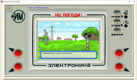 ! Данная версия для windows/linux! Эмулятор электронной игры, которая была популярна в конце 80-х-начале 90-х годов 20 века - Электроника ИМ02 "Ну, Погоди!". Игра на внимание и быстроту реакции. Смысл игры: управляя волком ловить катящиеся с 3х или 4х лотков яйца и набрать максимум очков. Если не поймать яйцо в корзинку оно разобъется. При этом игрок получает 1 или 0,5 штрафных очка в зависимости от того, выглядывал ли в этот момент из окошка заяц. Если заяц выглядывал, то волк как будто бы отвлекся на него, поэтому штраф меньше. Игра продолжается до трех штрафных очков. Особенности эмулятора: - полная аналогия электронной игры "Ну, Погоди!"; - режимы часов и будильника; - дополнительные возможности, которых не было в оригинальной игре: - возможность паузы в игре; - сохранение текущей и загрузка ранее сохраненной игры; - при наборе 999*3 очков долгожданный сюрприз: Вас ждет небольшой мультфильм. Режимы игры и режимы эмулятора: Кнопка игра А - яйца одновременно могут скатываться с любых 3-х лотков; Кнопка игра Б - яйца одновременно могут скатываться с 4-х лотков; Кнопка Время - режим показа текущего времени Кнопка Часы - не используется Кнопка Будильник - возможность установки подачи сигнала будильника в заданное время Режимы часов и будильника можно включать в режиме Рестарта (много волков, яиц и прочего на экране), после проигрыша. Во время работы в режимах игра А или игра Б кнопки Время и Будильник не реагируют (это имеет место в оригинальном электронном варианте игры). Напротив даже во время начатой игры игру можно запустить снова - кнопки игра А, игра Б реагируют стартом новой игры даже во время начатой игры (этого не было в оригинальном электронном варианте, но сделано для удобства). Управление игрой: для нажатия нужной кнопки на эмулируемой панели электронной игры используйте мышь. кроме того, в качестве клавиш управления волком могут служить: E O или 7 9 D K или 1 3 - на цифровой клавиатуре Пауза в игре - P Для сохранения и загрузки текущей игровой ситуации используйте окно опций вызываемое кнопкой O.