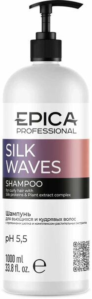 Шампунь Silk Waves от EPICA Professional - это профессиональное средство для ухода за вьющимися и кудрявыми волосами. Он деликатно очищает кожу головы, обеспечивая при этом контроль гидробаланса и восстанавливая структуру вьющихся волос. Шампунь Silk Waves содержит комплекс растительных экстрактов, включая экстракты яблока, банана и асаи, которые увлажняют, питают и придают волосам здоровый и ухоженный вид. Он также содержит пантенол, ниацинамид, глицерин, гиалуроновую кислоту и бетаин, которые способствуют увлажнению, питанию, эластичности и блеску волос. Продукт имеет уровень pH 5.5, что делает его подходящим для ежедневного применения. Шампунь Silk Waves не содержит парабенов и сульфатов, что делает его безопасным для чувствительной кожи головы. Особенностью шампуня Silk Waves является его УФ-защита, которая помогает предотвратить повреждение волос от солнечного излучения. Объем бутылки составляет 1000 мл, что делает ее экономичным выбором для тех, кто хочет ухаживать за своими волосами на регулярной основе. Способ применения шампуня Silk Waves прост: нанесите его на влажные волосы, вспеньте и оставьте на 1-2 минуты, затем тщательно смойте. При необходимости повторите процедуру. EPICA Professional - российский бренд, который зарекомендовал себя на рынке профессиональной косметики для волос. Шампунь Silk Waves - это высококачественное средство, которое поможет вам заботиться о своих вьющихся волосах, делая их здоровыми, мягкими и блестящими.