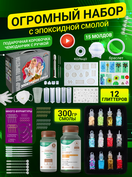 Эпоксидная смола для ручного творчества пользуется популярностью как у начинающих любителей, так и у профессиональных мастеров. Представленный набор не оставит равнодушным ни одного подростка и даже взрослого. В комплекте имеет все самое необходимой для работы со смолой: жидкая смола, отвердитель, силиконовые формочки для заливки, различные инструменты и аксесуары, принадлежности и фурнитура, декоративные баночки с глиттером или пигментами, а также пластиковые стаканы (3 шт), деревянные палочки и перчатки. Внимательно ознакомьтесь с комплектацией каждого набора на фото, они все разные(!), полная комплектация представлена на первом и втором фото товара. Прозрачная эпоксидная смола ювелирная без запаха, не требует особых условий, благодаря этому с ней можно работать в любом проветриваемом помещении или комнате, использование СИЗ обязательны. Для создания заливки можно использовать неординарные наполнители: насекомых, бусины, кристаллы, зерна кофе, сухоцветы, пайетки, живые цветы, маленькие перья декоративные и ракушки, бисер, цветные блестки и глиттер для творчества. Представленной смолы из набора хватит на большое количество изделий. Такой развивающий комплект отлично подойдет для игры девушкам, мальчикам, подросткам и их родителям (к самостоятельному пользованию и работе с материалом допускаются только подростки старше 18+, а также взрослые женщины или девушки с творческим воображением). Продукция не подлежит обязательной сертификации, но все наши смолы имеют добровольный сертификат на соответствие госту, а также после полной полимеризации эпоксидная смола EpoxyDay безопасна на контакт с холодными пищевыми продуктами. В творческом комплекте имеются силиконовые молды (силикон на оловянной основе) для эпоксидной смолы разной формы и размера. Готовые фигурки используются для рукоделия, оформления различных игрушек (котов, мишек), брелка, предметов декора, колечки для девочек, самодельной бижутерии, украшений на шею, руку и другие части тела. В качестве красителя необходимо использовать только специальные материалы совместимые с эпоксидкой: колеры, перламутры, красящий элементы, в ином случае можно испортить полученное изделие. Благодаря такому универсальному набору, можно создать набор колец, браслетов, бус, подвесок, магнитов, кулонов, заготовки для творчества, аксессуаров для скрапбукинга, украшения для подростков. Данный подарочный набор для хобби и досуга поможет развить художественный навык у начинающих, а также заинтересует опытных мастеров. Раньше мы знали только материал: эпоксидный клей, но сейчас существует множество смол с различным применением, в нашем ассортименте есть смолы: для заливки, для рисования, для столешниц, для творчества. Развивающий комплект идеален в качестве подарка на день рождения, Новый год и Рождество, 8 марта, 23 февраля, любые женские и другие семейные, ежегодные праздники. У нас есть акции и распродажи, вы можете купить наши товары в подарок со скидкой! Так же в ассортименте нашего магазина вы найдете комплекты с э