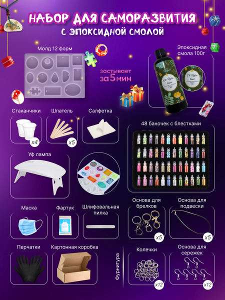 Хотите подарить необычный и интересный подарок, который легко поможет развить творческие способности? Набор из эпоксидной смолы для творчества – это именно то, что вам нужно! Основное преимущество данного набор это наличие УФ смолы, что позволит значительно сократить время на изготовление украшений ( обычная смола с отвердителем 24 часа, с уф смолой 10 минут ) Данный набор позволит вам самостоятельно создавать необычные украшения из быстросохнущей однокомпонентной эпоксидной смолы, которая не требует смешивания. В комплекте имеются все необходимые материалы и инструменты для работы: уф смола (100гр) ее ключевая особенность заключается в том, что она изначально находится в жидком состоянии, но в течение 10 минут под воздействием ультрафиолетового излучения превращается в твердый предмет, ультрафиолетовая лампа, различная фурнитура, силиконовые формы, блестки добавят изделиям оригинальности и яркости, а декоративные элементы в виде фруктов добавят индивидуальности, блестки (48 штук), шлифовальная пилка, мерные стаканы, маска, которую необходимо надевать, перчатки, фартук, салфетки, декоративные элементы и инструкцию по использованию. Благодаря формам для заливки вы сможете создавать стильные и уникальные аксессуары и сувениры своими руками: серьги, кулоны и подвески, сердечки, браслеты, а также использовать ее для декорирования поделок. Этот набор будет интересен для тех кто любит рукоделие, лепку, рисование и творчество, не только подросткам, но и взрослым (под присмотром взрослых, 14+) — он поможет провести долгие зимние вечера с пользой, развить воображение и изготовить уникальные изделия ручной работы, которые особенно ценятся любителями творчества. Он поставляется в крафтовой упаковке и станет оригинальным подарком! Закажите набор из эпоксидной смолы прямо сейчас и начните создавать яркие и оригинальные изделия!