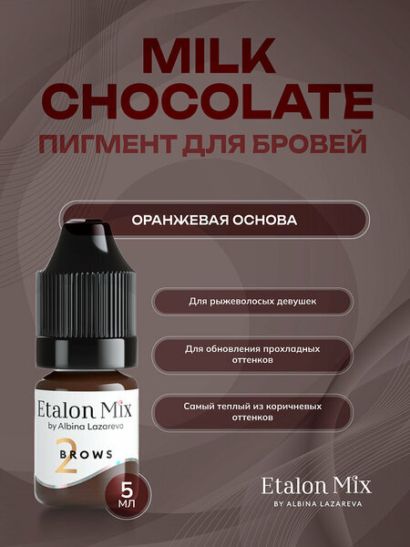 Микс #2 «Молочный шоколад»: 1) оранжевая основа; 2) для рыжеволосых девушек или для обновления прохладных оттенков; 3) самый тёплый из коричневых оттенков; Пигменты для перманентного макияжа татуажа бровей Etalon Mix от Альбины Лазаревой изготовлены с учетом особенностей всех типов кожи. С пигментами для пм от эталон микс мастера перманента легко могут создавать собственные миксы и подбирать пигменты для каждого типа кожи — пигменты отлично смешиваются между собой для получения нужного оттенка. Вся продукция эталон микс прошла тщательную проверку качества и сертифицирована. Пигменты etalon mix от Альбины Лазаревой ежедневно используют мастера перманента в своих салонах красоты и тату-салонах по всей стране. Эталон микс учитывают особенности всех типов кожи, не вызывают аллергии, поэтому с ними легко работать на любом уровне, как опытному мастеру перманента, мастеру тату, так и новичку в пм. Бровная линейка пигментов etalon mix — это живые коричневые цвета через год и более. Пигменты представлены в объеме 5 и 15мл. Микс №1 Hazelnut на желтой основе. Лесной орех универсальный оттенок, в легком напылении тёплый коричневый, в плотном напылении серо-коричневый. Микс №2 Milk Chocolate на оранжевой основе, для рыжеволосых девушек или для обновления прохладных оттенков. Молочный шоколад самый тёплый из коричневых оттенков. Микс №3 Cognac на красно-коричневой основе, для оливковой кожи и перекрытия зеленых бровей. Коньяк очень красив на тени в градиенте с Горький шоколад или Трио. Микс №4 Light Brown на желтой прохладной основе. Русый подойдет для перекрытия тепло-красных бровей на тени: самая светлая часть градиента. Микс №5 Dark Chocolate самый прохладный и темный из коричневых оттенков, в легком напылении средне-коричневый, в плотном напылении: графит. Горький шоколад применим на тени - самая темная часть градиента. Микс №11 Espresso на красно-коричневой основе. Светлее Коньяка, универсальный оттенок для 1-2 типа по Фицпатрику. Пигмент Эспрессо по составу больше неорганический пигмент.