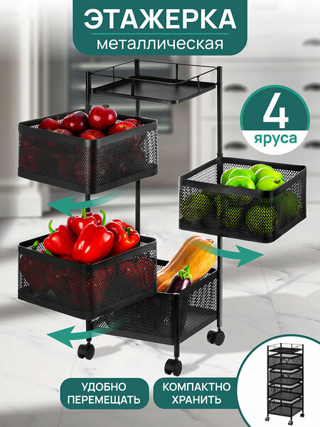 Этажерка 4-х ярусная "Черная" 27х27х80 см, с выдвижными корзинами, на колесиках, размер этажерки без колесиков 27х27х75 см, на 4-х колесиках, 2 колесика с фиксаторами, размер полки 26,5х26,5х6 см, размер корзин 26х26х14 см, расстояние между корзинами 2 см, высота от пола до нижней корзины без колес - 3 см, с колесами - 7,5 см, максимальная нагрузка на каждую корзину 5 кг, диаметр трубы 16 мм, металлическая