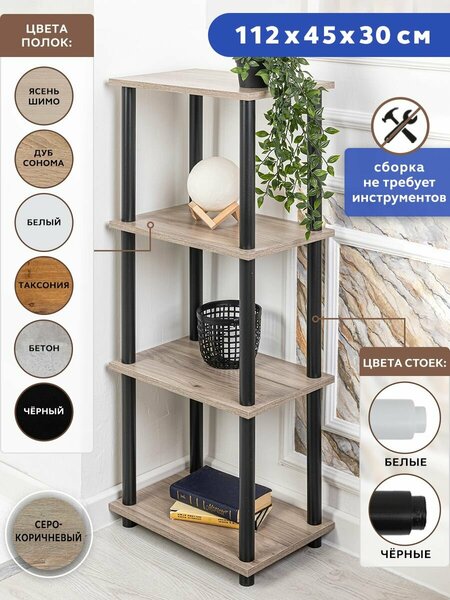 Этажерка деревянная 4 полки Gastrorag - это многофункциональная мебель для дома, дачи, офиса, салона красоты и косметологического кабинета. Мы разработали для вас универсальную и доступную 4 ярусную систему хранения вещей для любой комнаты в вашей квартире: прихожей и коридора, кухни, ванной и туалета, балкона и лоджии, гардеробной, кабинета, гостиной и спальни. Ее можно использовать как шкафчик для обуви и сумок или компактную обувницу в прихожей, полку для гардероба, полочку для полотенец в ванне или стеллаж для кухонной техники, посуды, овощей и фруктов. Она подойдет для хранения одежды и в качестве маленькой напольной книжной этажерки 4 секции для книг, детских игрушек и машинок, декора и предметов интерьера, подставки из дерева для домашних декоративных растений, комнатных цветов и рассады. Из нее получится отличная офисная стойка для папок, документов, канцелярских принадлежностей и оргтехники или этажерка для косметолога, мастера маникюра и педикюра, органайзер для косметики и духов. Открытый высокий стеллаж на пол не загромождает интерьер и придает ему легкость. Вы можете поставить его в угол, узкую нишу или, например, купить несколько штук и собрать из них один большой открытый шкаф, мини стенку или перегородку для зонирования и организации пространства. Этажерка loft четыре яруса укомплектована полками из экологичной ЛДСП класса Е0.5. Изделия из этого материала можно безопасно использовать даже в детской - для ребенка, подростка и школьника. Полочки соединяются между собой стойками из пластиковой трубы диаметром 34 мм. Размер полки 45х30 см, высота мебели в собранном виде 113 см. Расстояние между полками этажерки 34 см, что позволяет размещать на них даже крупногабаритные предметы. Стеллаж ЛДСП четырех полочный имеет небольшой вес, быстро собирается без инструментов и легко переносится с места на место. Благодаря современному минималистичному дизайну 4 секционная этажерка в стиле лофт впишется в любой интерьер. Обратите внимание! Сборку нужно начинать с верхней полки! Допустимая распределенная нагрузка на полку до 6,5 кг. Для большей устойчивости рекомендуем ставить стеллаж вплотную к стене.
