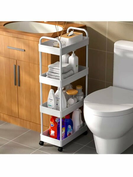 Этажерка пластиковая — это универсальный функциональный стеллаж для узкого пространства. Размеры: длина 41 см х ширина 22 х высота 93 см. Этажерка на колесиках используется как стеллаж для ванной, туалета, для прихожей, в спальне, детской, на кухне. Стеллаж на колесиках - набор универсальных полок для организации хранения ванных принадлежностей, туалетной бумаги, моющих и чистящих средств, мелких игрушек, косметических средств, цветов и рассады, зарядных устройств, для фруктов. Белая этажерка на колесах для ванной используется как ящик для хранения вещей, домашних мелочей или как мебель для ванной, для дачи, балкона, комнаты. Этажерку напольную передвигайте в правильное место: легко вписывается в любой интерьер. Полка в ванную поместится везде. Товар подойдет для шкафа. Этажерка узкая собирается без использования инструментов. Металлическая полочка для ванной состоит из четырех ярусов и эргономично встраивается в интерьер. Быстро моется и легко чистится. Такой полезный органайзер станет ценным подарком на праздник как женщинам, девушкам, маме, бабушке, так и мужчинам. Обеспечьте себе комфорт и уют дома.