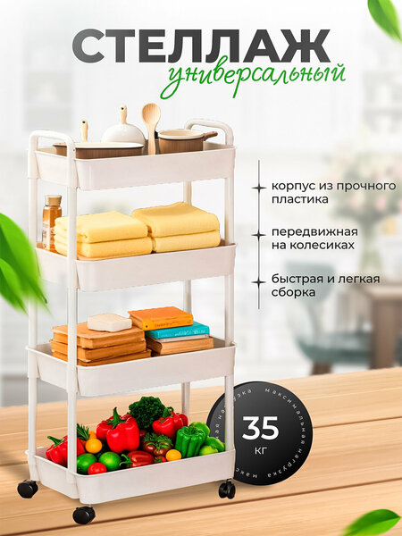 Этажерка пластиковая — это универсальный функциональный стеллаж для узкого пространства. Размеры: длина 41 см х ширина 22 х высота 93 см. Этажерка на колесиках используется как стеллаж для ванной, туалета, для прихожей, в спальне, детской, на кухне. Стеллаж на колесиках - набор универсальных полок для организации хранения ванных принадлежностей, туалетной бумаги, моющих и чистящих средств, мелких игрушек, косметических средств, цветов и рассады, зарядных устройств, для фруктов. Белая этажерка на колесах для ванной используется как ящик для хранения вещей, домашних мелочей или как мебель для ванной, для дачи, балкона, комнаты. Этажерку напольную передвигайте в правильное место: легко вписывается в любой интерьер. Полка в ванную поместится везде. Товар подойдет для шкафа. Этажерка узкая собирается без использования инструментов. Металлическая полочка для ванной состоит из четырех ярусов и эргономично встраивается в интерьер. Быстро моется и легко чистится. Такой полезный органайзер станет ценным подарком на праздник как женщинам, девушкам, маме, бабушке, так и мужчинам. Обеспечьте себе комфорт и уют дома.