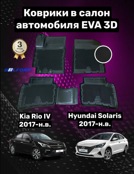 Эва/Eva/Ева коврики c бортами Киа Рио 4 (2017-)/Хендай Солярис/Kia Rio IV(X-line)/Rio X/Hyundai Solaris DELFORM 3D Premium ("EVA 3D") cалон