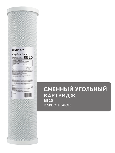 Забудьте о неприятном запахе и привкусе воды! ЭВИТА — это магистральный (т. е. для квартиры или дома) угольный фильтр bb 20 на основе прессованного активированного угля, предназначенный для кондиционирования воды, а также механической очистки. Ресурс – 24 000 литров, производительность до 20 л/мин. Угольный фильтр ЭВИТА bb20 — незаменимый картридж для любой магистральной системы очистки. Ничто не удаляет хлор и его соединения эффективнее активированного угля. Активированный уголь – лучший природный адсорбент. В вашем небольшом фильтре спрятана площадь нескольких футбольных полей! 10 грамм активированного угля = площади 1 футбольного поля. За счет своей плотной монолитной структуры карбон-блок ЭВИТА выгодно отличается от засыпных фильтров отсутствием канального эффекта. Картридж bb20 обеспечивает превосходную фильтрацию, улучшая вкус и цвет воды, делая ее более безопасной и приятной для использования. Преимущества фильтра ЭВИТА bb20 Высокая эффективность очистки: Прессованный активированный уголь обладает увеличенной площадью поверхности, обеспечивая более глубокую и качественную фильтрацию. Сочетание разных типов очистки в одном картридже: Благодаря своей структуре угольный фильтр bb20 ЭВИТА удаляет механические загрязнения и улучшает вкус, цвет и запах воды. Соотношение цены и качества: Наш угольный фильтр bb20 рассчитан на длительный срок службы при доступной цене, что делает его экономичным решением. Простая установка и замена: Картридж bb20 легко устанавливается в стандартные корпуса фильтров bb20. Безопасность и надежность: Изготовлен из материалов, безопасных для контакта с питьевой водой. Технические характеристики: Типоразмер: bb20" (Big Blue) Тонкость фильтрации: 10 мкм Ресурс: до 24 000 литров Скорость фильтрации (производительность): до 20 л/мин Рекомендуемая периодичность замены – 1 раз в 3 месяца. Предназначен ТОЛЬКО для холодной воды +5 до +35 градусов.