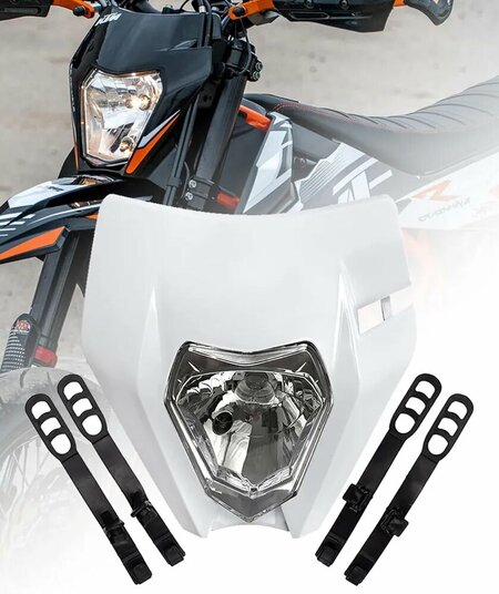 Благодаря универсальному креплению, фара крепится на амортизаторы передней вилки ( перья ) мотоцикла (питбайка) с помощью штатных резиновых ремней. Это позволяет установить фару практически на любой питбайк или мотоцикл (KAYO, BSE, PITSTER PRO, JMC, FMC, MOTOLAND, YCF, APOLLO, AVANTIS, SSSR, Альфа, TTR ) Фара идёт в комплекте с лампой H4 и ремнями для крепления.