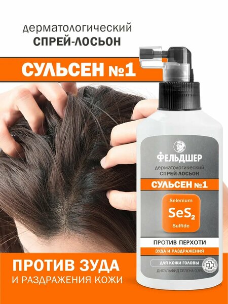 Дерматологический спрей-лосьон Сульсен эффективен при борьбе с перхотью, себореей и грибковых поражений. При нанесении на кожу головы, спрей-лосьон очищает от загрязнений и сложной перхоти, уменьшает зуд. Активный компонент сульфид селена (SeS2) подавляет рост микрогрибков, вызывающих перхоть, снимает дискомфорт, зуд и раздражение, успокаивает кожу головы. При регулярном использовании предотвращает повторное появление перхоти. Для достижения лучшего результата, спрей-лосьон применяется в комплексе с шампунем “Сульсен №1” действие: