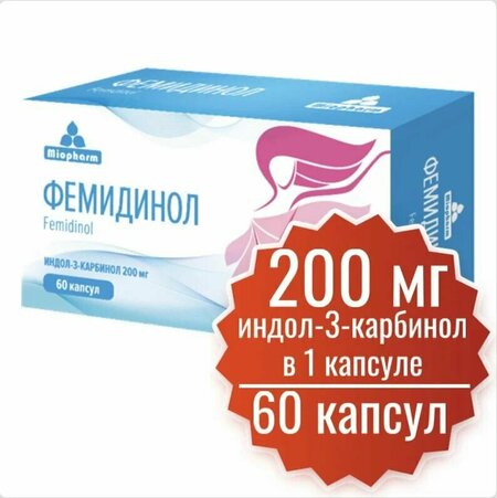 Препараты Миофарм более 6 лет продаются в аптеках по всей стране, что гарантирует высокое аптечное качество продукции, которое подтверждено СГР и системой Честный знак. Фемидинол - натуральный БАД для женского здоровья. Индол-3-карбинол, входящий в состав биологически активной добавки "Фемидинол" способствует замедлению патологических гиперпластических процессов в органах и тканях женской репродуктивной системы (молочные железы и эндометрий, миометрий, яичники, шейка матки). Индол-3-карбинол получают из крестоцветных овощей, таких как брокколи, цветная капуста и брюссельская капуста. В его основе лежит активное вещество, которое способствует нормализации метаболизма эстрогенов и снижению уровня вредных метаболитов, что важно для профилактики гормонозависимых заболеваний. Применение добавки помогает уменьшить выраженность симптомов климакса и менопаузы, таких как приливы, раздражительность и перепады настроения, а также способствует улучшению общего самочувствия. Каждая капсула содержит 200 мг индол-3-карбинола, который играет важную роль в регуляции гормонального баланса и снижении риска развития заболеваний, связанных с гормональными изменениями в организме. Продукт идеально подходит для женщин в возрасте, стремящихся поддерживать стабильное самочувствие и качество жизни. Индол-3-карбинол (индол 3 карбинол) также обладает мощными антиоксидантными свойствами, защищая клетки организма от окислительного стресса и предотвращая преждевременное старение. Его комплексное действие помогает поддерживать здоровье молочных желез, репродуктивных органов и щитовидной железы. Комплекс витаминов для женщин с индол-3-карбинолом поможет сохранить здоровье, молодость и энергию, обеспечив полноценное функционирование организма даже в условиях возрастных изменений. Рекомендации по применению: женщинам по 1 капсуле 1 раз в день во время еды.