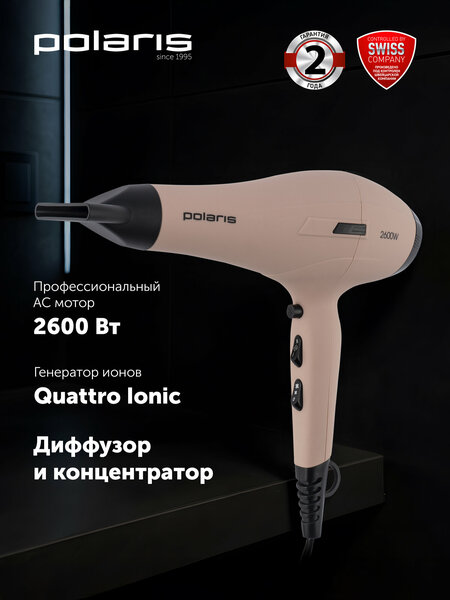 Фен Polaris PHD 2600AСi Salon Hair – профессиональный помощник для безупречного образа. Встроенный ионизатор нейтрализуют статику, защищает цвет окрашенных волос и предотвращают сечение кончиков. Мощный АС мотор на 2600 Вт обеспечивает быструю сушку даже густых и кудрявых прядей, сохраняет естественную влагу и сокращает время укладки до нескольких минут. Технология защиты от перегрева предотвращает повреждение структуры волос. Устройство имеет 3 температурных и 2 скоростных режима. Инструмент сочетает мощность профессиональной техники для красоты и здоровья с удобством бытового прибора. Функция холодного обдува Cool Air Jet закрепляет укладку, придавая ей долговечность и объем. Режим Colour Defence бережно сушит сухие и поврежденные локоны, сохраняя насыщенный цвет. Узкий концентратор предназначен для выпрямления и стайлинга отдельных прядей. Насадка диффузор нужна для бережной сушки вьющихся, кудрявых или волнистых волос, сохранения их естественной текстуры, уменьшения пушистости и добавления объёма за счёт рассеивания воздушного потока. Мягкое прорезиненное покрытие Soft Touch делает использование устройства комфортным, а петля для подвешивания добавляет удобства в хранении и эксплуатации. Женский фен подходит для укладки челки, завивки, восстановления секущихся кончиков. Съемная решетка-фильтр продлевает срок службы прибора, защищая его от загрязнений. Компактный дизайн, эргономичная ручка и стильный внешний вид делают устройство превосходным аксессуаром для дома или салона красоты. Профессиональный результат без посещения парикмахерской: идеальные локоны, мягкие кудри, гладкость и объем. Электрический фен с ионизацией и регулятором температуры заботится о каждом типе волос и дарит им здоровый блеск. Подарочный набор Polaris PHD 2600AСi — бытовая техника для женщин, ценящих бережный уход. Это идеальный подарок на День Рождения, 8 марта для любимой мамы, жены, дочери, подруги, девушки или сестры. Подарите любимым новый образ с феном Polaris 2600AСi Salon Hair — технологичным решением для стильных причесок на каждый день!