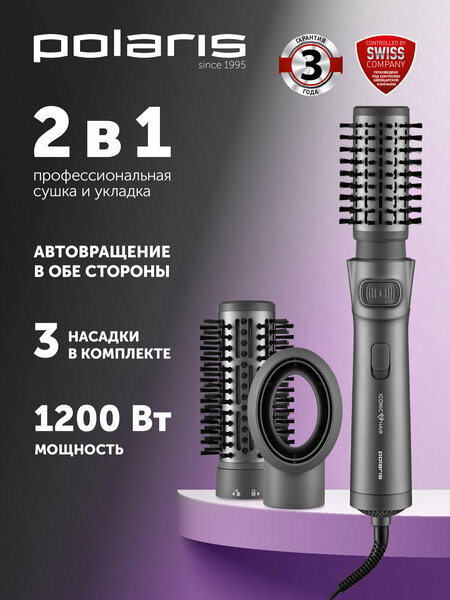 Фен-расческа Polaris PHSB 1100Ri – профессиональный помощник для создания идеальных причесок. Мощный электрический фен-щетка 2 в 1 сочетает сушку и укладку, даря волосам гладкость, объем и здоровый блеск. Благодаря автовращению насадок (в обе стороны) сушка и укладка происходит одновременно. Технология Flex Brush с ультрамягкими щетинками обеспечивает плавное скольжение, бережно распутывает кудри и мягко стимулирует кожу головы. В набор входят 3 насадки для укладки: брашинг 40 мм и 50 мм для создания объема и завивки, а также круглая насадка-концентратор с двойными стенками для быстрой и безопасной сушки. Инструмент сочетает мощность профессиональной техники для красоты и здоровья с удобством бытового прибора. Минерализированное керамическое покрытие MultiMineral с эффектом инфракрасного излучения способствует сохранению внутренней влаги волос, бережному уходу за цветом и сохранению яркости. Генератор ионов последнего поколения c 4-х кратным усилением Quattro Ionic нейтрализует статику, защищает цвет окрашенных локонов и предотвращает сечение кончиков. Фен-расческа оснащена 3 температурными режимами 2 скоростями обдува. Защита от перегрева и шнур с вращением 360° делают использование прибора безопасным и удобным. Компактная сумка для хранения позволяет брать технику с собой в поездку или путешествие. Профессиональный результат без посещения парикмахерской: идеальные локоны, мягкие кудри, гладкость и объем без вреда. Электрический фен-щетка с ионизацией и регулятором температуры заботится о каждом типе волос, даря здоровый блеск. Фен-расческа Polaris PHSB 1100Ri – технологичное решение для стильных причесок на каждый день!