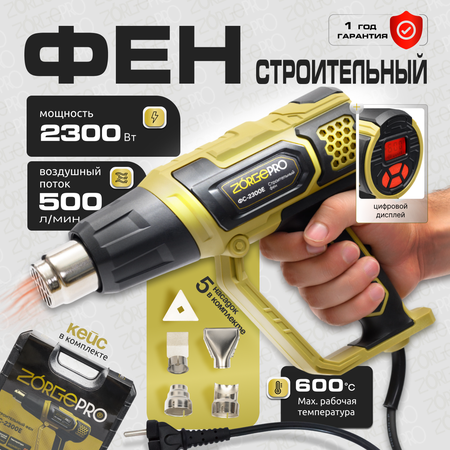 Фен строительный ZORGEPRO ФС-2300, 2000Вт, 300-500л/мин, температура 60-600°С, с набором