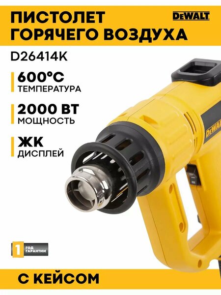Пистолет горячего воздуха DEWALT D26414 применяется для различных операций по сушке, снятию лакокрасочных покрытий, сварочных работ. Фен промышленный комплектуется двумя насадками. Строительный фен деволт имеет ЖК дисплей позволяет контролировать рабочую температуру. Мощный двигатель с эффективным охлаждением устойчив к перегреву. Устойчивая конструкция обеспечивает безопасное стационарное использование. Взять в аренду Преимущества Dewalt D26414-KS: Ударопрочный корпус DEWALT D26414; Работа в стационарном положении; Плавная регулировка температуры; Фен технический девольт имеет мощный двигатель для высокой производительности; Легкий и компактный дизайн для удобства пользователя; Превосходный контроль и память настроек температуры для применения в одинаковых условиях. Фен строительный