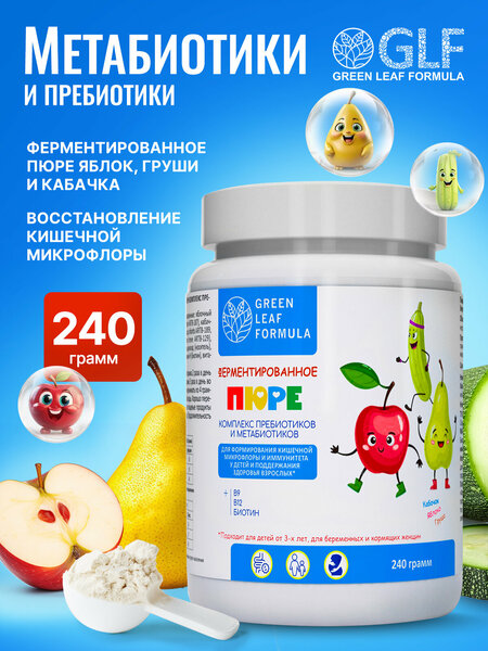 Ферментированное пюре для детей от 3 лет – это уникальный комплекс пребиотиков и метабиотиков на основе ферментированной мякоти яблока, груши и кабачка в сочетании с биотином (витамин H), фолиевой кислоты (витамин В9) и витамином В12, для формирования микрофлоры кишечника, стойкого иммунитета в период роста и развития детей и подростков. Взрослые, в том числе, беременные и кормящие женщины, также могут принимать витаминный комплекс с пребиотиками и метабиотиками для поддержания здоровья и восстановления кишечной микрофлоры. Удобный способ применения детского комплекса витаминов и пробиотиков: сухую смесь растворить в воде или размешать с пищевыми продуктами (молоко, сок, морс, компот, овощные и фруктовые пюре, каши, творог). Дозировка согласно информации на этикетке в зависимости от возраста. Многочисленные исследования учёных разных стран подтверждают, что при ферментации овощей и фруктов получается продукт, имеющий значительно большую пищевую ценность чем исходный. Ферментированное пюре способствует: - формированию кишечной микрофлоры у детей; - эффективно восстанавливает собственную микрофлору; - нормализации рН кишечника; - нормализации обменных процессов; - правильному развитию иммунной системы. Консорциум штаммов пробиотических бактерий в препарате по составу и количеству соответствует нормальной здоровой микрофлоре детей и подростков. Штаммы не требуют хранения в холодильнике, их полезные (пробиотические) свойства определены и доказаны. Ферментированная мякоть яблока, груши и кабачка является полноценным источником питания для пробиотических микроорганизмов, а также содержит целый комплекс биологически активных веществ: - витамины (А, В1, В2, В3, В5, В6, В9, В12, С, D, Е, Н); - макро- и микроэлементы (кальций, кремний, натрий, магний, фосфор, железо, кобальт, марганец, медь, молибден, селен, хром, цинк); - ферментированную клетчатку; - минорные сахара; - органические кислоты и др. В комплексе также содержатся растворимые пищевые волокна, галакто и глюкоманнаны, факторы роста микроорганизмов и жизненно необходимых витаминов. Витамины группы В в составе продукта являются эпигенетическими регуляторами и способны положительно влиять на регуляцию экспрессии генов, что очень важно для нормального развития детей и поддержания здоровья взрослых. Не содержит: диоксид титана, химический краситель, ГМО, глютен, лактозу. Форма выпуска: порошок 240 г.