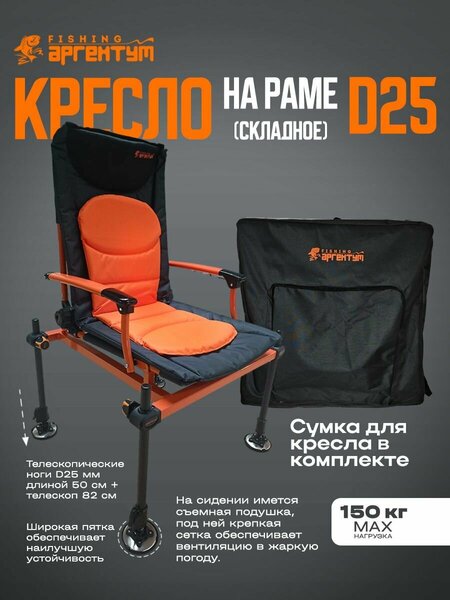 Предлагаем приобрести стильное и очень надежное фидерное кресло для рыбалки с подлокотниками "Аргентум Fishing" модель WDY-602M на ноге диаметром 25 мм. Отличный выбор для любителей ловли на поплавочную удочку и фидер. Утолщенная съемная подушка кресла позволяет комфортно находится в нем на протяжении длительного времени. Кресло рыболовное складное имеет четыре ноги D 25 мм, которые снимаются. Сумка для транспортировки фидерного рыболовного кресла в комплекте. Покрытие сделано из высокопрочной, износостойкой и водонепроницаемой ткани. Имеется удобный мягкий подголовник. Сиденье легко снимается и имеет множество уровней регулировки наклона. Кресло имеет легкий и ультрапрочный алюминиевый каркас на трубчатой основе. Оснащено ножками d 25 с возможностью независимой регулировки высоты. Нижняя часть ног укомплектована стальной опорной площадкой из нержавеющей стали, что в комплексе с телескопическими опорами позволяет установить кресло на любой неровной поверхности. Кресло легко складывается и переносится. Четыре точки для крепления аксессуаров. Данное кресло для рыбалки комплектуется транспортировочной сумкой, что является очень полезным и востребованным аксессуаром. Размер фидерного кресла: 55*54*37/105 см. Вес: 8,78 кг. Нагрузка - до 120 кг. Ноги кресла длинной: 50 см, в выдвинутом состоянии: 82 см.