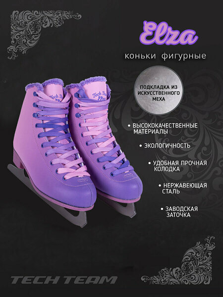 Коньки Tech Team Magic Elza - женские любительские коньки. При подборе размера выбирайте на размер больше, чем ваш российский размер обуви! Если нога широкая и/или имеет высокий подъём - скорее всего вам подойдут коньки на 2 размера больше. Ботинки коньков сделаны жесткими специально чтобы удерживать вашу ногу от заваливания и уберечь от травмирования. Созданы для начинающих спортсменок, которые начинают спортивную карьеру или просто для тех, кто хочет покататься в удовольствие. Коньки очень удобно снимать и одевать при наличии одной только шнуровки, вверху установлены специальные крючки. Верх коньков из морозостойкой искусственной кожи. Подкладка сделана из короткого синтетического меха, это позволит сохранить тепло. На модели установлено специальное лезвие из нержавеющей стали. Лезвие имеет зазубрины спереди и заводскую заточку. Размерный ряд - с 32 по 42.