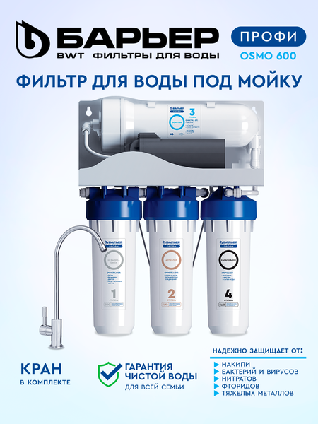 Компактный бытовой безбаковый осмос с рекордной производительностью - 1,6 л/мин. 600 галонная обратноосмотическая мембрана пропускает только молекулы воды, задерживая все остальные загрязнения. 100% защита от накипи, бактерий и вирусов, а также нитратов, нитритов, фторидов, тяжелых металлов. Система состоит из четырех ступеней очистки: 1. Механика 5 мкм - очищает воду от песка, ржавчины и других нерастворимых частиц. 2. Антихлор - доочистка воды от хлора, хлорорганики и фенольных соединений. 3. Обратноосмотическая мембрана защищает от бактерий и вирусов, солей жесткости, нитратов, нитритов, фторидов, тяжелых металлов. 4. Карбон-блок - улучшает вкусовые качества и запах воды. Преимущества «БАРЬЕР ПРОФИ ОСМО 600»: Суперкомпактная система – помещается даже в самом ограниченном пространстве под мойкой; Рекордная производительность – 1,6 л/мин; Эффективное соотношение воды и дренажа – 2,5:1; Мембрана обратного осмоса - 600 галлон; Встроенный насос с допустимым по нормам уровнем шума; Универсальные картриджи формата SL10; Всё необходимое для подключения в комплекте. Для работы насоса необходимо наличие розетки в зоне установки фильтра. Использование электрических удлинителей в пространстве под мойкой запрещается. Система предназначена для использования только в БЫТОВЫХ целях.