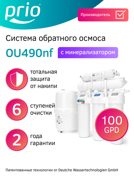 Без крана в комплекте. Данная модификация подходит в том случае, если планируется использование комбинированного смесителя либо любого другого крана, не входящего в данный базовый комплект. OU490 отличается от OU490nf наличием крана в комплекте: в OU490 присутствует, в OU490nf отсутствует. Для данных моделей выпускаются наборы сменных картриджей: Prio K655 - для моделей OU490/OU490nf (артикул: Prio K655) Prio K654 - для модели OU480 (артикул: Prio K654) Рекомендуемая замена - раз в 6 мес. Мембрана Prio NOX100 меняется раз в 1-2 года, в зависимости от состава исходной воды и регулярной замене остальных картриджей Имеющиеся модификации в серии: OU480 - угольный постфильтр (артикул: Prio OU480) OU490 - двухступенчатый постфильтр: уголь + минералы (артикул: Prio OU490) OU490nf - двухступенчатый постфильтр: уголь + минералы, без крана чистой воды (артикул: Prio OU490nf). Данная модификация подходит в том случае, если планируется использование комбинированного смесителя либо любого другого крана, не входящего в данный базовый комплект. Просим обратить внимание! Система обратного осмоса с минерализатором OU490 отличается от OU480 одним картриджем-постфильтром! OU480 — K884 (гранулированный активированный уголь из скорлупы кокосового ореха). OU490 — K885 (комбинированный 2-в-1: уголь + минералы). Инструкция и коробка у обеих моделей одинаковые. Упаковочный короб имеет модификации двух видов — цветной и монохромный (эко). Фильтр для воды с обратным осмосом Start Osmos OU490 — это классический шестиступенчатый фильтр с минерализатором, являющийся бестселлером в своем классе как недорогая, но качественная и безотказная система очистки воды с обратным осмосом. Традиционная мембрана форм-факторе 1812 в отдельном корпусе производительностью 100GPD, обеспечивает полноценную глубокую очистку водопроводной воды от распространенных загрязнителей: механических примесей (ржавчины, ила, песка и т. п.), растворенных примесей, таких как свободного хлора, хлорорганических соединений, тяжелых металлов, радиоактивных элементов, солей жесткости и иных органических и неорганических веществ, бактерий и вирусов. Система очистки воды обратного осмоса OU490 отлично справится с умягчением воды и полностью решит проблему накипи! Благодаря новому минерализатору 2-в-1(уголь + минералы) K885, чистая вода обогащается ионами Са2+, Мg2+, Na+, K+, CO32-, SO42-, Cl-, F- с целью улучшения ее органолептических показателей. Проще говоря, устраняет неприятные запахи и придает воде вкус родниковой! Более того, стоимость владения системой OU490, с учетом сменных картриджей в течение в 5 лет, выйдет в десятки раз дешевле, чем покупка бутилированной воды сомнительного качества. За 15 рублей в сутки, Вы получаете доступ к вкусной, безопасной воде высшего качества в объеме до 100 литров, без бутылок! При этом, стоимость 1 литр составит всего 15 копеек! Если сравнивать со стоимостью покупной воды аналогичного качества, то 5-тилитровый бутыль в магазине стоит от 100 рублей и выше против 70 копеек за 5 литров из фильтра. При потреблении, в среднем 10 литров воды, выходит около 200 рублей за баклажки по 5 литров. В месяц - 6000 рублей, а в год - 72000 рублей! За те же 10 литров из фильтра с водой высшего качества - всего 15 рублей, в месяц - 450 рублей, а в год - 5400 рублей! 5400 рублей против 72000 рублей! Выгодно? Да! В комплект фильтра обратного осмоса для воды OU490nf входит: - Современный надежный накопительный бак Prio X842G 3.2G (12 л. - общий о