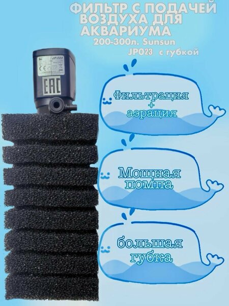 Фильтр с подачей воздуха для аквариумов 200-300 литров Sunsun JP023 с губкой Мощный погружной фильтр для аквариума и акватеррариума, Сансан, серия JP023 с губкой. Фильтр универсальный, подходит для всех видов густонаселенных пресноводных и морских аквариумов, и акватеррариумов с водными рептилиями и амфибиями. Фильтр от легендарного бренда SUNSUN, который больше тридцати лет является мировым лидером в сфере производства оборудования для прудов и аквариумистики. Фильтр осуществляет механическую очистку за счет крупнопористой губки, собирает остатки корма и продукты жизнедеятельности водных обитателей, делает воду прозрачнее. Крупнопористая губка, обеспечивает размножение нитрифицирующих бактерий, усиливая фильтрующий эффект. Фильтр оснащен насадкой для аэрации воды, которая позволяет насыщать воду растворенным кислородом. Модульная схема позволяет добавлять фильтрующие секции, увеличивая эффективность фильтра. Ось ротора – из нержавеющей стали, не подверженной коррозии. Фильтр можно установить как вертикально на стенку, так и горизонтально на дно. Антивибрационные резиновые присоски для легкого и прочного крепления фильтра. Корпус фильтра изготовлен из прочного пластика, не подвержен окислению, нейтрален к воде. Высококачественная полимерная изоляция мотора, полная безопасность и защита от замыканий. Низкое потребление электроэнергии и высокая производительность. Стабильная, бесшумная работа, не нагревается и не греет воду. Фильтр рассчитан на режим работы: 24 часа, 7 дней в неделю. Основные характеристики фильтра: Производительность: 1000 литров в час. Фильтр подходит для аквариума объемом 200 - 350 литров. Максимальная высота подъема воды 1,3 метра. Потребляемая мощность 16 Ватт в час, работает от сети 220В, 50Гц. В комплект с фильтром входит: Фильтр, полностью готовый к работе с насадкой для аэрации воды и губка фильтрующая размерами 10*10*20 см. Инструкция. Кратко о правилах эксплуатации: Если возникли шумы при работе, необходимо очистить фильтр от отложений. Внимание! Фильтр работает только в погруженном состоянии. Главное условие - фильтр не должен работать всухую иначе через весьма короткий промежуток времени он выйдет из строя. Нежелательна установка вверх дном поскольку в этом случае внутри фильтра может образовываться воздушный пузырь, ведущий к шуму и перегреву.