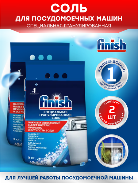 FINISH Соль специальная гранулированная для посудомоечных машин 3 кг. х 2 уп. Соль для посудомоечных машин Финиш – это незаменимый помощник в уходе за вашей посудомоечной машиной. Специально разработанная формула и крупные гранулы соли эффективны в борьбе с накипью и известковым налетом, что делает ее идеальным выбором для любой кухни. Вода, содержащая много минералов, может привести к снижению производительности вашей техники, поэтому использование соли Finish помогает значительно улучшить её работу. Эта соль активизирует процесс смягчения воды, что препятствует образованию известкового налета внутри машины. Благодаря этому ваши приборы дольше сохраняются в целости и сохранности, а посуда после мытья блестит без разводов и пятен. Большие гранулы соли обеспечивают её медленное растворение, что усиливает защитные свойства ионообменника, который является ключевым элементом в борьбе с жесткой водой. Регулярное использование соли для посудомоечных машин Finish позволит вам продлить срок службы вашей техники, избегая затрат на ремонт и обслуживание, связанные с образованием накипи. Кроме того, такой подход гарантирует не только чистую посуду, но и ее сохранность, так как на ней не будут появляться замысловатые следы и пятна. Не забывайте о важности заботы о своей посудомоечной машине – это не только продляет срок её службы, но и улучшает качество мытья вашей посуды. Сделайте выбор в пользу соли Finish, чтобы обеспечить максимальную эффективность и долговечность вашей техники. Соль Finish – доверенное решение для защиты вашего оборудования и достижения превосходных результатов. Средства для ПММ: соль для посудомоечных машин Финиш, таблетки для посудомоечной машины Финиш, ополаскиватель для посудомоечной машины Финиш, капсулы для посудомоечной машины Финиш, очиститель для посудомоечных машин, порошок для посудомоечной машины Финиш, гель для посудомоечной машины Финиш