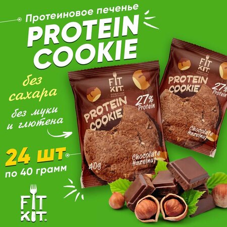 Протеиновое печенье без сахара Fit Kit Protein Cookie, упаковка 24шт по 40г (шоколад-фундук)