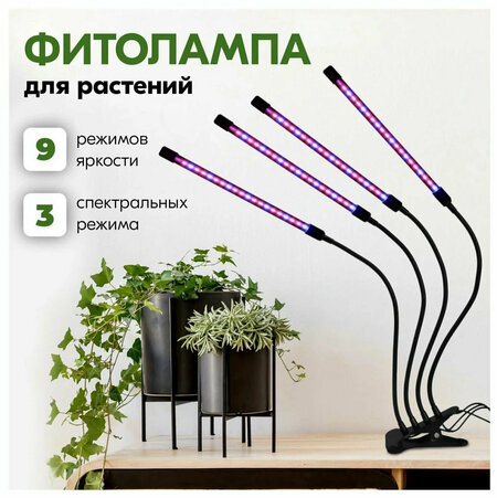 Cветильник для растений, состоящий из 4-х отдельных фитоламп на светодиодах пригодится каждому, кто выращивает цветы, зелень, овощи и рассаду у себя на подоконнике. Светодиодный фитосветильник полностью решает проблему недостаточного освещения для растений. Короткий световой день больше не помеха, в любое время года вы можете дома выращивать с фитолампой здоровые растения, и получать урожай свежих экологически-чистых овощей без пестицидов. Светодиодный светильник для растений может светить в трех цветах на выбор: - синий - фиолетовый - красный Это очень удобно, так как растения в различные периоды своей жизни нуждаются в различных световых спектрах. Например, в начальной фазе роста им необходим синий цвет. В фазе цветения растениям больше нужен красный спектр. Фиолетовый спектр необходим для стимуляции роста, при цветении растений. Фитолампу полного спектра можно регулировать на 9 уровней света. В фитосветильнике также предусмотрен таймер для достижения эффективных результатов, вы можете поставить его на время работы: 3, 9, 12 часов. Светильник для растений состоит из 4 отдельных фитоламп, каждая из которых рассчитана на 3-5 небольших растений. Рабочая температура светодиодов: от -20 до 50 градусов Цельсия. Мощность светильника 40 Вт. Регулируемые подвижные ножки, на которых закреплены светодиоды, позволяют направлять потоки света в нужные стороны так, как вам это необходимо. Ножки закреплены на регулируемом зажиме фито лампы, можно менять положение. В комплекте к светильнику для растений идет USB-провод. Провод оснащен пультом управления с 4 кнопками. Внимание: не допускается попадание воды на фито лампу! Светодиодный светильник для растений подходит для выращивания их на подоконнике дома, в офисе или другом месте. Фитолампа позволит каждому завести огород в домашних условиях, в закрытом помещении. Дачникам позволит получить здоровую и крепкую рассаду и отлично подготовиться к дачному сезону.