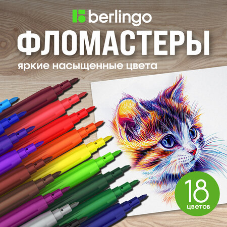 "Фломастеры Berlingo серии Жил был кот – это идеальный набор для детского рисования, творчества и обучения. Яркие и насыщенные цвета в количестве 18 штук позволяют создавать удивительные рисунки, развивая воображение и мелкую моторику. Благодаря водной основе, чернила легко смываются водой с кожи и и большинства материалов, что делает их идеальными для малышей от 3 - лет, учеников младших классов и дошкольников. Вентилируемый колпачок гарантирует дополнительную безопасность, а полипропиленовый корпус значительно продлевает срок службы классических смываемых фломастеров. Устойчивый пишущий узел детских фломастеров сохраняет форму даже при активном использовании, а круглый корпус удобно ложится в руку ребенка даже первоклассника. Они прекрасно подходят для школы, раскрашивания, скетчинга, выделения текста, занятий на мольберте и простой детской раскраски. Толщина линии составляет 2 мм, длина письма 500 метров, что идеально как для создания тонких линий и деталей, так и заполнения больших площадей. Высокое качество исполнения делает набор не только удобным, но и долговечным — фломастеры пишут плавно, не теряют интенсивности цвета и не пересыхают при правильном хранении. Это особенно важно для использования в школах, детских садах и дома. Упакованные в удобную упаковку, фломастеры легко брать с собой в школу, садик или на занятия. Подходят как для девочек, так и для мальчиков, и станут отличным дополнением к школьному набору, особенно в сезон подготовки к 1 сентября." Вся информация предоставлена продавцом