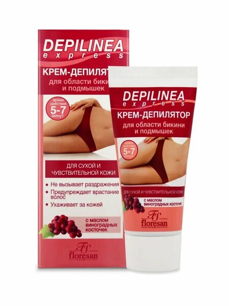 Floresan Крем депилятор для области бикини и подмышек 50 мл. Благодаря новейшей формуле с комплексом натуральных экстрактов, крем-депилятор Floresan нежно и бережно удаляет нежелательные волоски в деликатных зонах бикини и подмышек. Масло виноградных косточек, входящее в состав комплекса, деликатно ухаживает за кожей уже во время депиляции, быстро снимает покраснение и ощущение дискомфорта. Экстракты календулы и зеленого чая смягчают, питают и успокаивают кожу, предотвращая появление вросших волос. Подходит для сухой и чувствительной кожи, прост и удобен в применении, позволяет сохранить гладкость кожи до 2-х недель. - Без раздражения - Предупреждает врастание волос - Мягкость и гладкость кожи В комплекте с кремом идет лопатка для удобного и гигиеничного использования. Состав: Aqua, Potassium Thioglycolate, Cetearyl Alcohol, Urea (карбамид), Potassium Hydroxide, Paraffinum Liquidum, Ceteareth-20, Vitis Vinifera Seed Oil (масло виноградных косточек), Calendula Officinalis Extract (экстракт календулы), Camellia Sinensis Leaf Extract (экстракт зеленого чая), Calсium Hydroxide, Parfum.