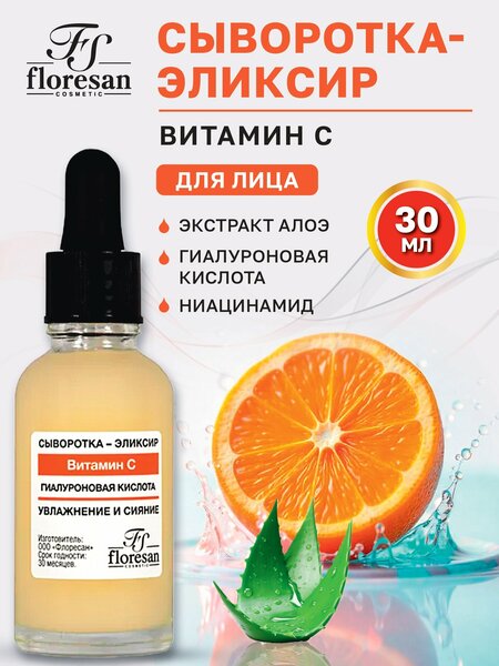 Floresan Beauty - Fruity Сыворотка-эликсир антиоксидантная Витамин C 30 мл. Сыворотка-эликсир Floresan Beauty - Fruity с гиалуроновой кислотой и высоким содержанием витамина С предназначена для интенсивного ухода за кожей в условиях мегаполиса. Витамин C - один из главных витаминов красоты, который замедляет процессы старения, предупреждая образование свободных радикалов, окисляющих клетки эпидермиса. Синергия гиалуроновой кислоты и витамина С улучшает выработку коллагена, повышает упругость и увлажненность кожи. Комплекс витаминов и экстрактов в составе сыворотки стирает следы усталости, осветляет, противостоит воздействию ультрафиолета, возвращает тонус и упругость. Сыворотка уменьшает пигментные пятна, выравнивает цвет лица и придает коже здоровое сияние. Способ применения: Ежедневно утром и/или вечером нанесите на предварительно очищенную кожу лица и декольте. Оставьте до полного впитывания. Только для наружного применения. Состав: Aqua, Propylene Glycol, Aloe Barbadensis Extract (экстракт алоэ), Niacinamide (ниацинамид), Ascorbyl Palmitate (аскорбил пальмитат), Glycine (глицин), Camellia Sinensis Leaf Extract (экстракт зеленого чая), Tocopheryl Acetate (витамин Е), Hyaluronic Acid (кислота гиалуроновая), Ascorbic Acid (кислота аскорбиновая), PEG-40 Hydrogenated Castor Oil, Trideceth-9, Carbomer, Triethanolamine, Parfum, DMDM Hydantoin.
