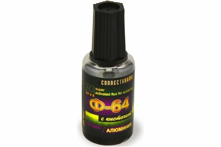 Паять алюминий легко и без предварительной зачистки поверхности может флюс Ф-64. Применение этого флюса для пайки алюминия и лёгких сплавов превращает эту задачу в такую же простую как пайка канифольным флюсом по меди. Цвет флюса: от свело-коричневого до буро-коричневого Температурный интервал активности: от 180 до 350 С Состав: ТЭА, фториды, ингибиторы коррозии, смачивающие присадки, деионизированная вода. Нанести на место пайки. Произвести пайку. Удалить остатки, промыв водой. Меры безопасности: Пайку проводить в хорошо проветриваемом помещении. При попадании на руки - промыть водой. Упаковка: Пластмассовый флакон с крышкой с кисточкой.