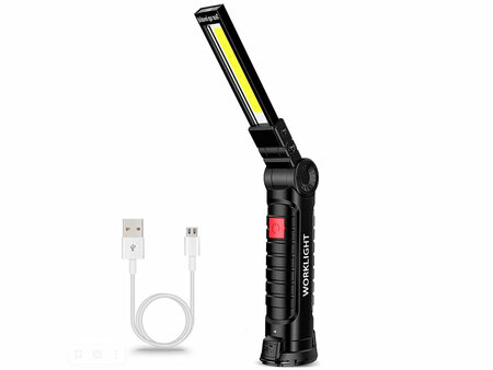 Светодиодный фонарь Worklight XPG+COB (ручной фонарь W52) многофункциональный c магнитом и крючком имеет 5 режимов подсветки: Белый свет (яркость 100%) Белый свет (яркость 50%) Торцевой фонарик 1 LED Аварийный красный свет (длительное нажатие) Аварийный, мигающий красный свет. Источник света 16 светодиодов + 1 светодиод на торце. Складной фонарь имеет 2 шарнира, плавно вращается на 360 градусов и надежно фиксируется в каждом положении. На рукоятке находится магнит, с помощью которого можно, например, прикрепить фонарь под капотом во время ремонта авто, или на крышу как аварийку. Портативный фонарик имеет крючок для удобного крепления на дерево в походе. Кроме того складной фонарик можно просто поставить на ровную поверхность, все для того чтобы освободить руки во время работы. Корпус фонарика сделан из металла и пластика, устойчив к падениям и не боится влаги. Пластиковая ручка с софт тач покрытием исключает cкoльжeниe фонаря в руке. В комплекте: фонарь, кабель для зарядки.