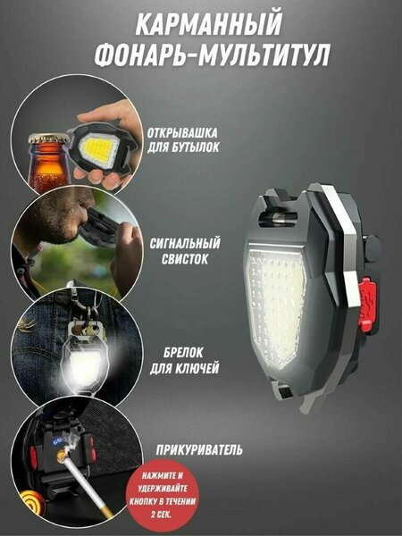 Мощный светодиодный мини фонарик с современными COB светодиодами. Портативный фонарь обеспечит яркое освещение 700 Лм, где бы вы ни находились: на рыбалке, в гараже или на даче под дождём. Ручной фонарик имеет степень защиты от воды и пыли IP65. Кемпинговый аккумуляторный фонарь весит всего 47 гр, имеет прочный металлический корпус и встроенный перезаряжаемый аккумулятор мощностью 650мАч. На обратной стороне фонарь диодный имеет мощный магнит, которым вы можете прикрепить фонарь к капоту машины, стене гаража, станку и т. д, освободив себе руки для инструмента. Прожектор светодиодный переносной можно брать с собой на рыбалку, в туристический поход или в путешествие: фонарик туристический аккумуляторный надежно крепится к рюкзаку карабином. Приятный бонус: встроенная открывашка для бутылок и встроенный прикуриватель. LED-фонарик имеет 7 режимов работы, которые переключаются нажатием одной кнопки: 1 нажатие - 500 Лм, 2 нажатие - 300 Лм, 3 нажатие - желтое свечение 500 Лм, 4 нажатие - желтое свечение 300 Лм, 5 нажатие - красное свечение, 6 нажатие - мигание красным свечением, 7 длительное нажатие (2 секунды) - 700 Лм.