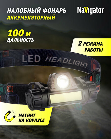 Налобный светодиодный фонарь от Navigator — устройство, которое будет полезно многим. Фонарик на аккумуляторе имеет 2 режима работы: сфокусированный дальний свет 100м и заливающий ближний свет 50 м. В кемпинговом фонаре на голову установлены 2 мощных светодиода 1 CREE LED, 5 Вт и 1 COB LED, 3 Вт. Фонарь выполнен из пластика и оснащен мощным магнитом на корпусе – что очень удобно в работе. Эластичные ремни, регулируемые по длине, надёжно фиксируют светодиодный фонарик на голове, шапке, кепке и даже на шлеме или каске. Дальнобойный фонарик работает от встроенного литий-ионного аккумулятора 4,3 В 1200 мА·ч, который обеспечивает до 4 часов бесперебойной работы. Заряжается от USB, кабель для зарядки идет в подарок. Налобный фонарь для туризма весит всего 85 г, а также не боится дождя и снега (степень защиты IP 44, режим рабочих температур от -20 до + 60 градусов). Налобник — это незаменимый помощник в ситуациях, когда необходимо качественное освещение и свободные руки, например: рыбалка, охота, туристический поход, пробежка, поездка на велосипеде и многие другие занятия спортом, в том числе и экстремальным. Идеально подходит для работы в автосервисе или гараже, пригодится на даче и кемпинге. Мощный фонарь заряжаемый поставляется в заводской упаковке, и станет отличным подарком для мужа, брата, папы или коллеги.