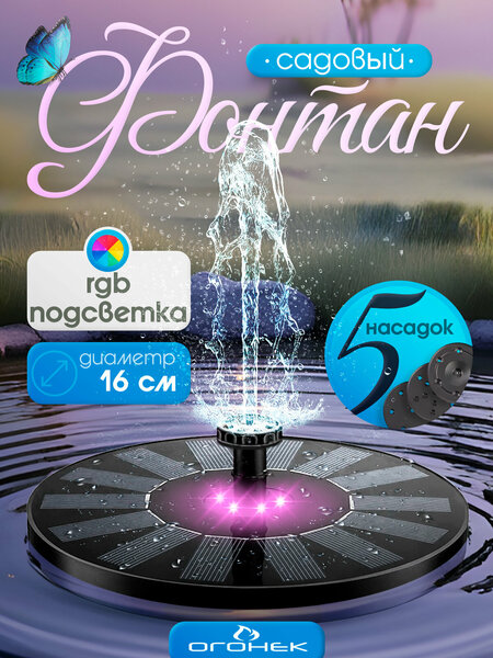 Фонтан садовый с подсветкой на солнечных батареях 16 см Огонёк OG-HOG09 - это стильный и функциональный декор для вашего сада. Он работает на солнечной энергии и так же имеет свой встроенный аккумулятор на 800мА. Запуск и Остановка фонтана происходит автоматически. Если солнце скрылось - фонтан продолжит работать от аккумулятора, пока не сядет. При появлении солнца, фонтан продолжит работу от солнечной панели и начнет заряжать АКБ. Фонтан прост в установке и использовании - достаточно поставить его на солнечное место и наслаждаться звуком плеска воды. Фонтан имеет разноцветную RGB подсветку, которая автоматически меняет цвет и создаёт уютную атмосферу. Фонтан подходит для различных целей: он может быть установлен в саду, на даче или вблизи пруда. Его небольшие размеры (16 см) позволяют легко разместить его в любом уголке сада. Фонтан с подсветкой выполнен в круглой форме, что создает гармоничный и эстетически привлекательный образ. Данный фонтан станет прекрасным украшением вашего сада, загородного дома. Он идеально впишется в стиль вашего дачного участка или коттеджа. Фонтан можно использовать как декоративный элемент, так и как источник воды для растений и животных. Производимая мощность (солнечная панель): DC 5В - 0.4А, 2 Вт Макс. Размер фонтана: 160 мм х 160 мм х 40 мм Питание насоса: DC 3.7В - 0.1А, 0.45 Вт Макс. Аккумулятор: Встроенный, 800мАч Максимальная производительность: 100-130 л/ч Особенности: Рабочий ресурс солнечной панели: до 20000 часов Требуемая интенсивность солнечного света: 10000> люкс