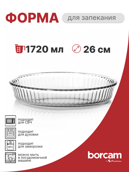 Форма для запекания Pasabahce-Borcam . Стеклянная посуда считается самой безопасной, т. к. при ее изготовлении не используется никаких компонентов. Стекло не вступает в реакцию с продуктами, поэтому не дает никаких посторонних привкусов и запахов, сохраняя все полезные свойства продуктов. Из-за низкой теплопроводности стекла - блюда в ней долго не остывают. Посуда из жаропрочного стекла выдерживает значительные перепады температур от -40 С до +300 С и предназначена не только для готовки, но и для хранения продуктов в холодильнике. В этой посуде можно подать блюдо к столу. В стеклянной жаропрочной посуде можно готовить пищу в духовых шкафах и микроволновых печах при t° +300 С. Она годится для любых видов электроплит, в т. ч. со стеклокерамическим покрытием. Диаметр: 260мм . Объем 1720мл.