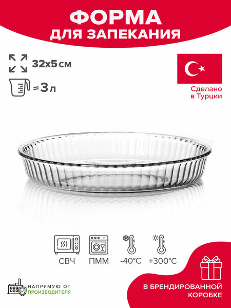 Достоинства:Стекло без дефектов, упаковка надежная (плёнка + картонная коробка), никаких нареканий. Хорошая форма для выпечки или просто блюдо. Досталась по очень хорошей цене Недостатки:Не замечено. Единственное, достаточно большой диаметр, так что под бисквит, наверное, нужен вариант поменьше. А для открытого пирога/киша получится в самый раз Комментарий:У меня была не красная, а из прозрачного стекла, но они идентичны