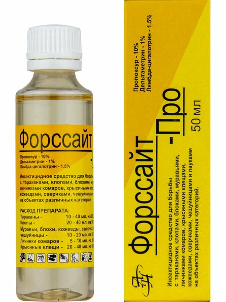 Форсайт про - это инсектицидное средство, которое предназначено для уничтожения постельных клопов, тараканов, блох, муравьев, мух и крысиных клещей. Оно представляет собой водорастворимый концентрат эмульсии, который легко разводится с водой. Средство обладает продолжительностью действия в 30 дней, что позволяет проводить повторную обработку через неделю. Особенностью Форсайт про является его многофункциональность. Оно может быть использовано как в помещении, так и на улице. Средство Форсайт про обладает умеренноопасными свойствами, что делает его безопасным для использования в домашних условиях. Способ применения средства прост и понятен: необходимо развести его с водой в указанных пропорциях, обработать места передвижения и обитания насекомых, а также исключить присутствие людей и домашних животных в помещении. В упаковке содержится 1 флакон объемом 50 мл. Выбирая Форсайт про, вы получаете надежное и эффективное средство для борьбы с насекомыми, которое поможет вам избавиться от них на 100%.