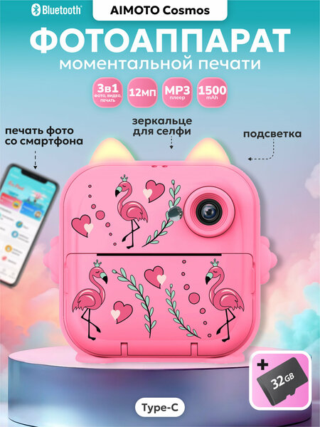 Фотоаппарат мгновенной печати Aimoto MagicCam полароид + 3 рулона бумаги, карта памяти 32 Гб, с моментальной печатью, детский для девочек и мальчиков, фламинго розовый