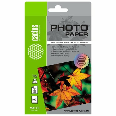 Фотобумага Cactus A6 10x15 матовая, 190г/м2, 100л, белая для струйной печати CS-MA6190100
