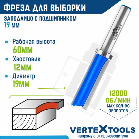 Фреза для выборки заподлицо VertexTools Ø 19 мм. / 12 мм. хвостовик, с верхним подшипником