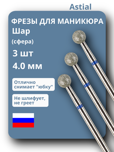 Алмазная фреза (бор стоматологический) Шар (сфера) средней абразивности 040 для маникюра ногтей и кутикулы, зернистость: средняя (синяя насечка). Эффективность работы фрезы зависит от техники мастера и индивидуальных особенностей кожи и ногтей, поэтому важно подобрать подходящую абразивность! Синяя насечка — это среднее алмазное напыление, подходит для работы с нормальной или слегка сухой кожей, поэтому является самым универсальным выбором. Рекомендуем включить в Ваш набор фрез для маникюрной машинки (аппарата для маникюра). Назначение так называемой круглой фрезы либо фрезы микрофон: раскрытие бокового валика и зоны кутикулы, обработка трещин, пирсинг ногтевой пластины. Фрезы алмазные из этого аппаратного маникюрного набора производятся по нашему заказу и под нашим контролем качества на заводе Владмива (Белгород) из нержавеющей стали и имеют алмазное напыление, выполненное гальваническим методом. Благодаря высоким стандартам качества, фрезы нашей марки Astial обладают повышенной прочностью, остротой и долговечностью. Аппаратный маникюр такими фрезами всегда получается аккуратным и чистым! Российский сертификат соответствия подтверждает высокое качество и позволяет использовать их даже для стоматологии, поэтому их второе название - стоматологические фрезы. За счет универсального хвостовика 2.35 мм такой набор фрез подойдет к профессиональным маникюрным аппаратам. Российское производство и наличие регистрационного удостоверения борфрезы гарантируют профессиональному мастеру маникюра в салоне красоты, студии маникюра, а также начинающему дома полное соответствие стандартам качества. Не дают вибраций в работе, не ржавеют после дезинфекции и стерилизации, благодаря правильной балансировке будет удобно работать с кутикулами и пазухами. С насадками маникюрными Astial можно решить любые задачи мастеров ногтевого сервиса по уходу за ногтями, обработки стоп и пяток в педикюре. Для профессионального и домашнего использования
