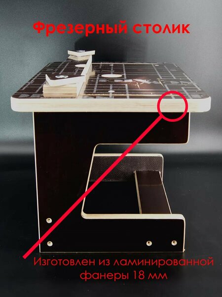 Фрезерный стол подойдёт для любого фрезера. За счёт выборки круга диаметром 17 см возможно подключение фрезера любых размеров до размера диаметра круга. Отверстие для фрезера к столику просверливаеться индивидуально в соответствии с моделью фрезера, рекомендуеться так же произвести самостоятельную зенковку отверстий для использования родных винтов фрезера и сохранения плоскости стола. Фрезерный стол для большей фиксации возможно прикрепить уголками к столешнице. Рабочее поле выполнено из ламинированной фанеры 18 мм, без острых углов, что позволяет работать с любой стороны столика для фрезера. Линейка позволяет регулирует расстояние и угол реза. Бонус возможно подключение пылесоса. Столик выполнен из ламинированной фанеры 18 мм, хорошая крепкая конструкция. Легкий доступ к фрезеру, для регулировки высоты. Поставляется в разобранном виде, рассчитан на быструю и легкую самостоятельную сборку. Размеры в мм: 450х300х300 (Ширина х Высота х Глубина). Мобильный фрезерный стоик. Возможно адаптировать стол под любой фрезер/триммер (Makita 3709). Погрешность плоскости столешницы может достигать до 1 мм. Но для работ где не требуется большая точность хорошее решение. Параллельный упор возможно отвести до 145мм от центра отверстия под фрезер, триммер.