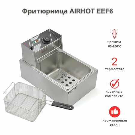 Электрическая фритюрница AIRHOT EE6 мощностью 2,3 кВт предназначена для приготовления разнообразных кулинарных изделий во фритюре. Обеспечивает получение золотистой корочки у чебуреков, пирожков, картофеля фри, сыра, рыбных палочек, роллов и т. д. Отлично подойдет для любого формата предприятия общественного питания и домашнего использования. Настольная электрофритюрница AIRHOT EE6 с крышкой выполнена из нержавеющей стали и имеет съемную чашу на 6 литров, корзину размером 205х180х100 мм. Ручка корзины выполнена из термостойкого пластика. Крышка фритюрницы способствует поддержанию чистоты и сохранению тепла в жарочной ванне. Перфорированное фальш-дно (разделительная пластина жарочной ванны) защищает ТЭН от контакта с корзиной. Фритюрница оснащена простым и понятным электромеханическим управлением: регулятор температуры 60-200°С, индикации "Включено" и "Нагрев". Защитный термостат отключает электропитание в случае перегрева. Если температура превышает допустимый предел, срабатывает предохранитель и отключается питание. Перезапустить состояние после срабатывания предохранителя от перегрева можно с помощью кнопки «Сброс» (RESET) на блоке управления, температура сброса состояния менее 170°С. Характеристики: