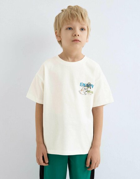 Молочная оверсайз-футболка с ярким принтом вдохновляет на весёлые игры! Приятный на ощупь джерси с качественным хлопком в составе актуален в любую погоду. Комбинируйте детскую футболку со спортивными брюками или джинсами от бренда «Глория Джинс». Модель представлена в двух вариантах: с застёжкой на плече для малышей до двух лет и без застёжки для мальчиков старше двух лет. Детали: крой oversize (оверсайз), круглый вырез горловины, короткие рукава, принт. Цвет товара может незначительно отличаться от реального цвета из-за особенностей вашего экрана. Гарантийный срок товара 30 дней.